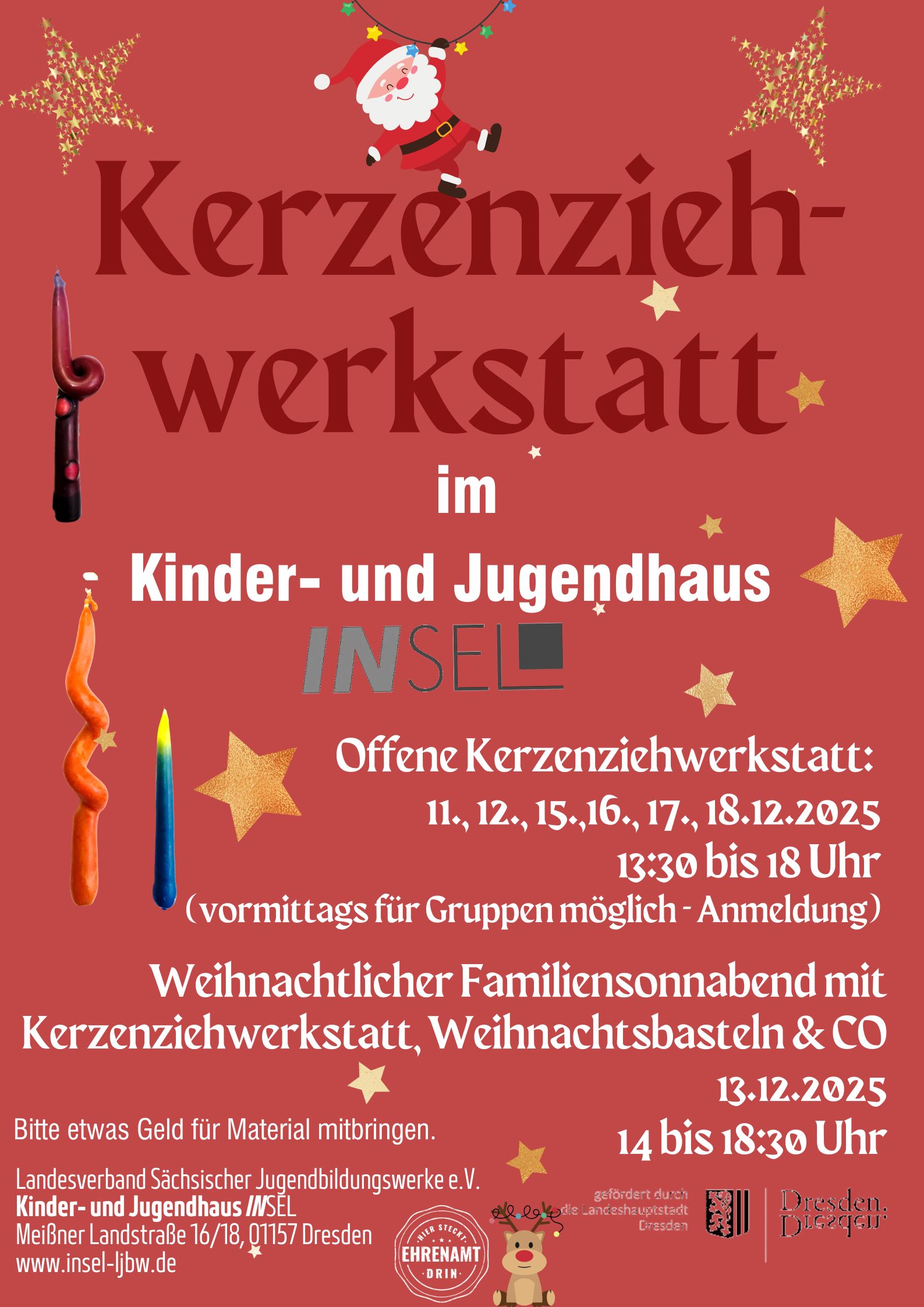 Am Samstag, 13.12. findet dann wieder unser Familiensamstag statt, der neben dem Kerzen ziehen noch Möglichlkeiten zum Weihnachtsbasteln und Weihnachtsbacken bietet.